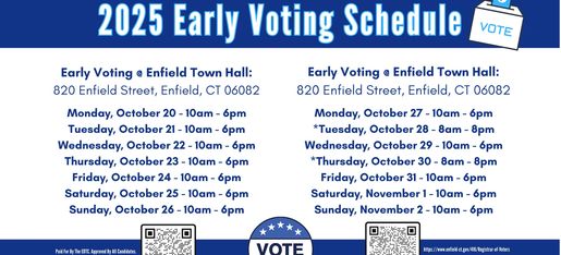EARLY VOTING BEGINS MONDAY, OCTOBER 20 AT ENFIELD TOWN HALL